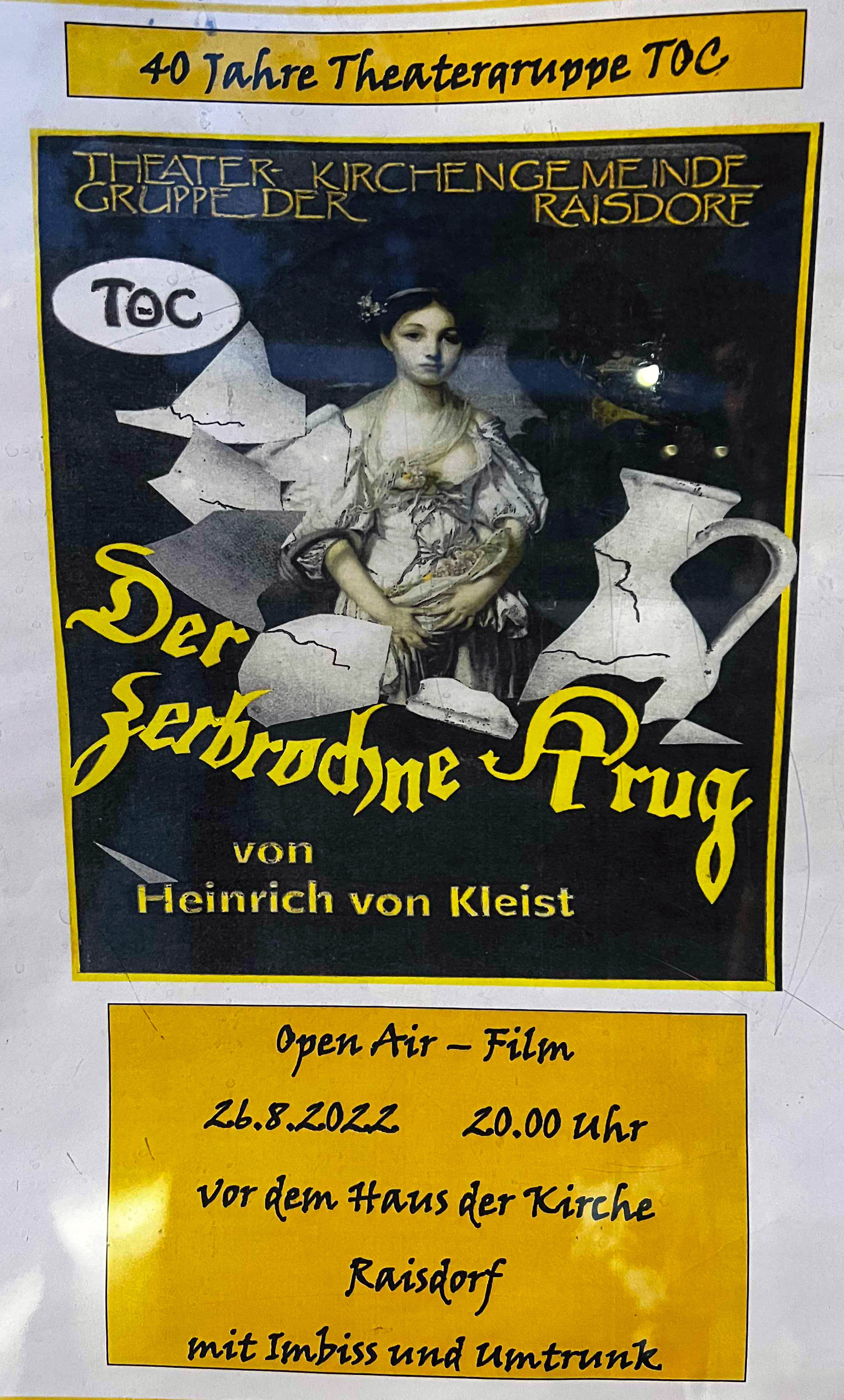 Am Freitag, 26.08. ab 20 Uhr zeigen wir im Rahmen des Raisdorfer Stadtfestes unser Stück "Der zerbrochne Krug" von Heinrich von Kleist.